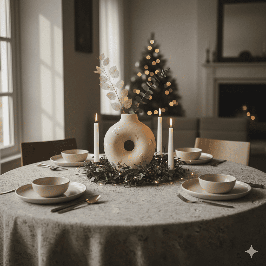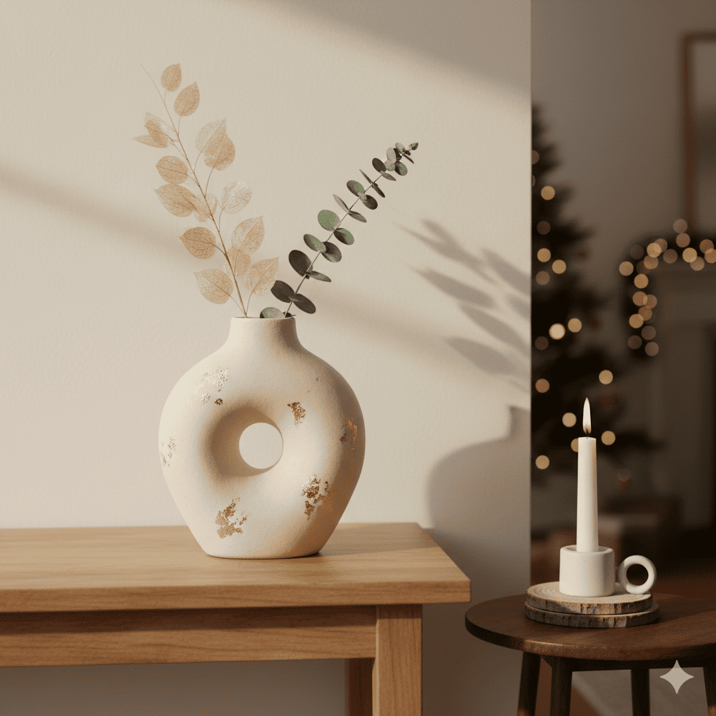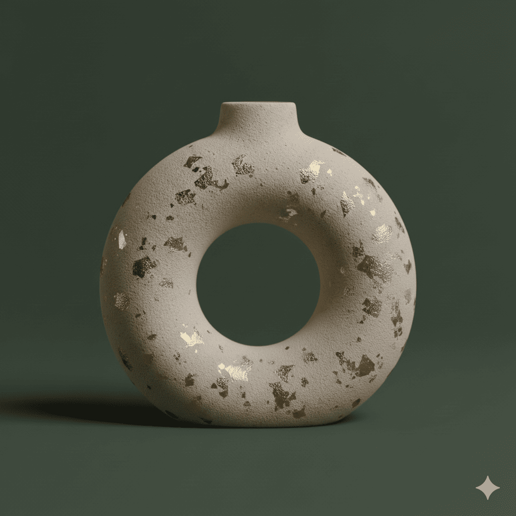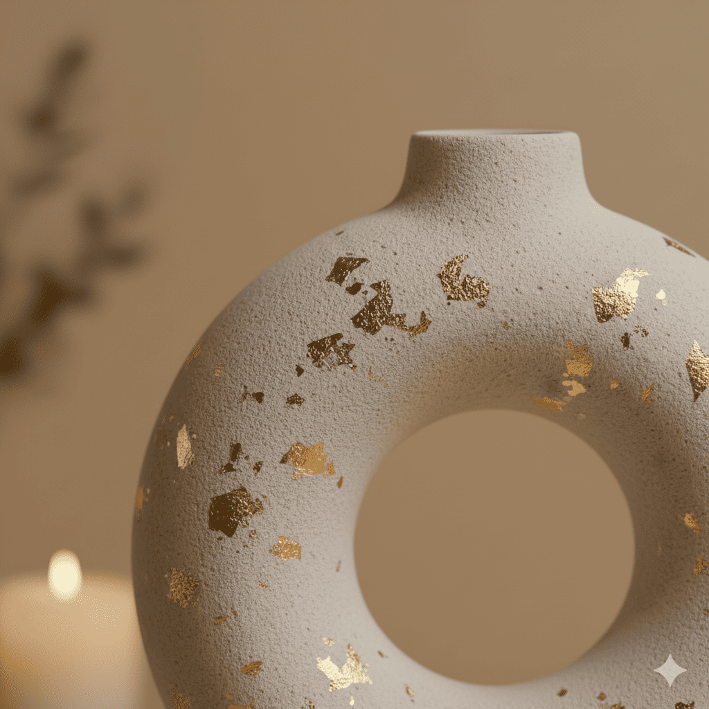 El Jarrón “Aurora Dorada” combina la pureza de la cerámica mate con finos destellos dorados aplicados a mano. Es una pieza pensada para atraer luz sin perder sobriedad, manteniendo el equilibrio perfecto entre lo festivo y lo natural.