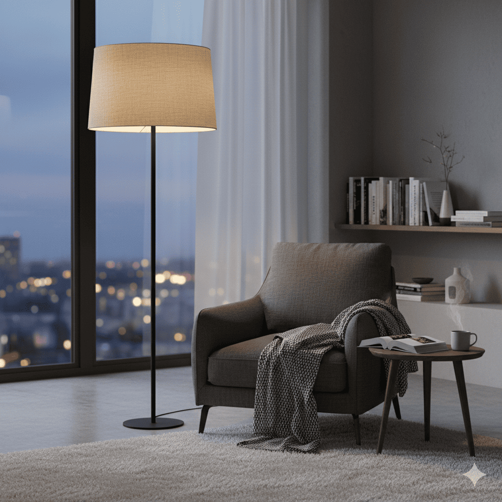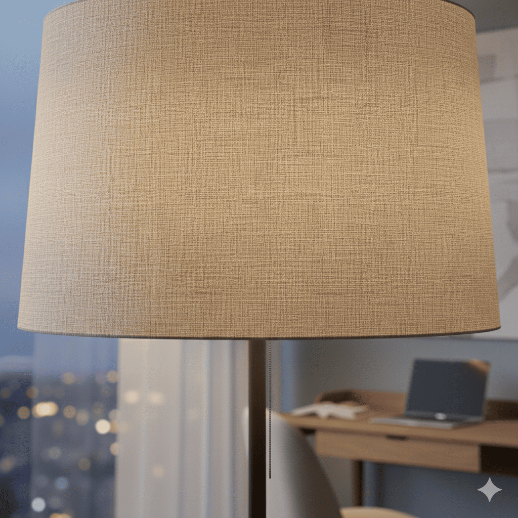 Lámpara de pie estilizada con base metálica negra y pantalla cilíndrica natural.