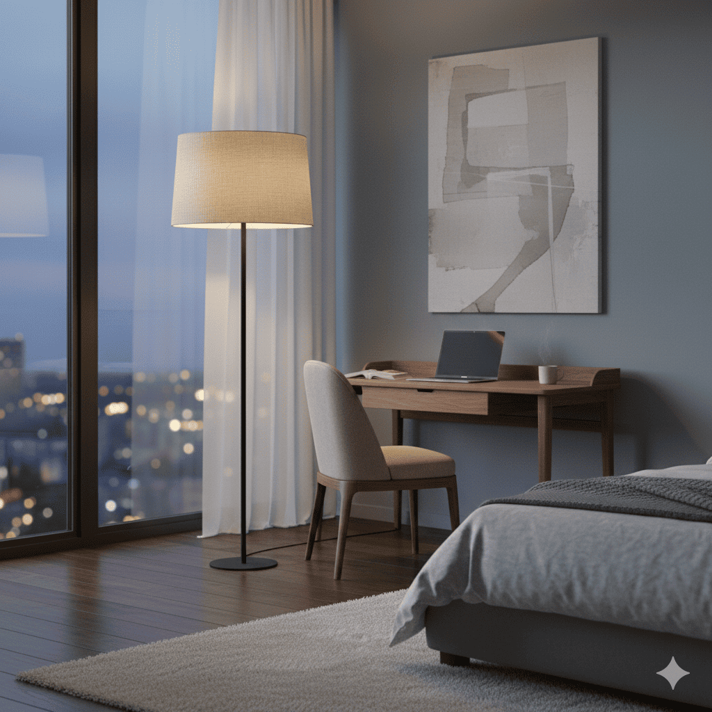 “Bold” introduce verticalidad y estilo en cualquier estancia. Su estructura alta y esbelta contrasta con su pantalla de lino natural, que suaviza la luz y crea un ambiente cálido. Ideal para salones, dormitorios o rincones de lectura.