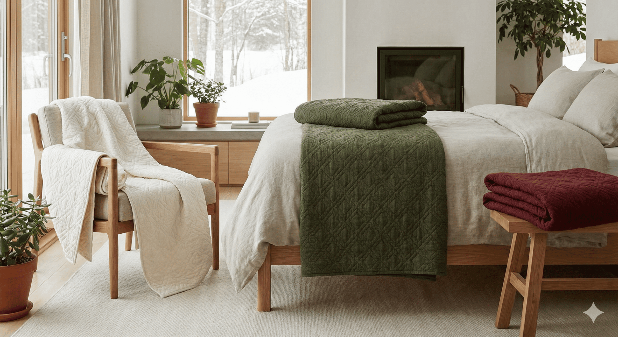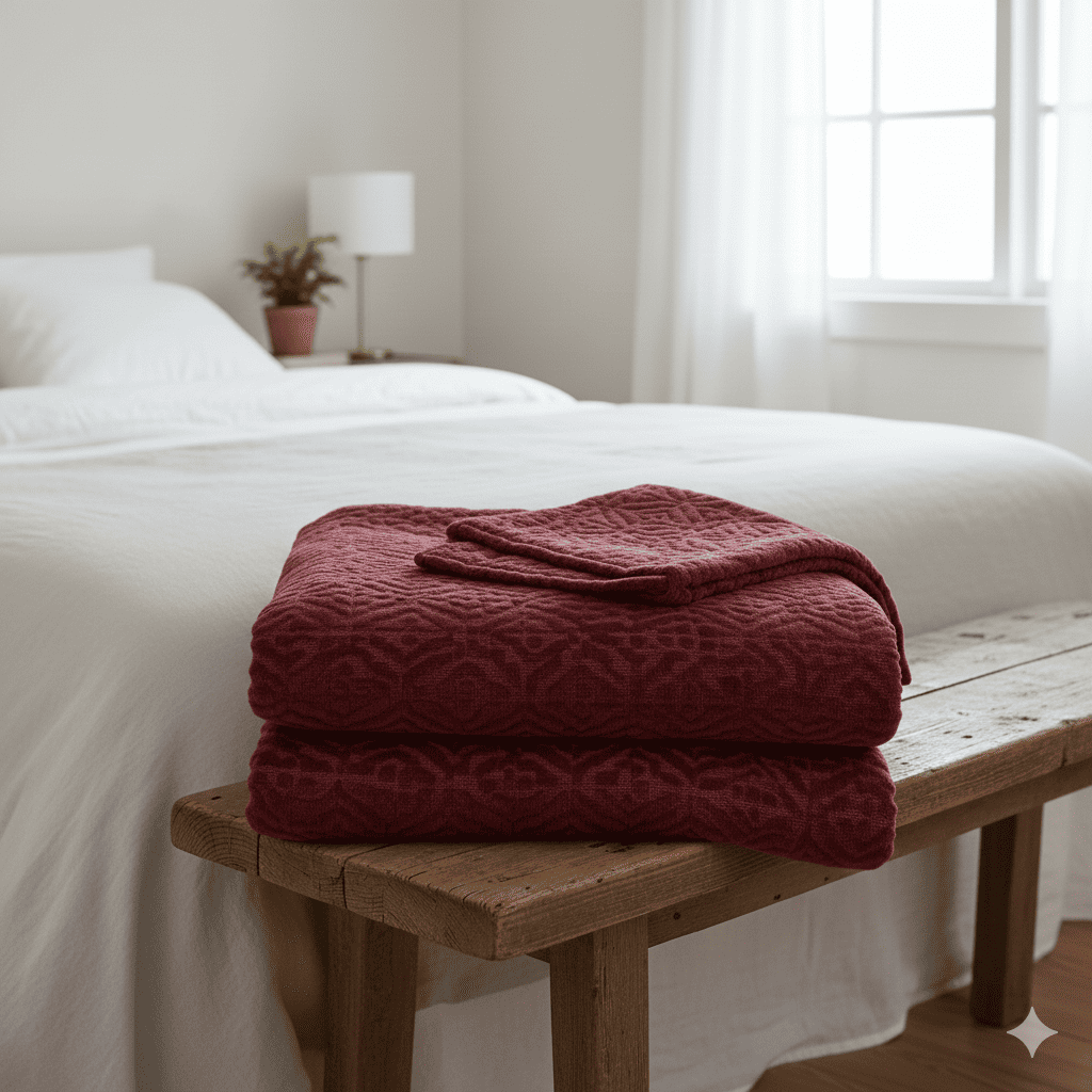 “Loom Nordic” destaca por su textura acolchada y su diseño geométrico sutil. Fabricada en materiales sostenibles, es perfecta para aportar calidez durante el invierno o decorar el pie de la cama. Sus colores naturales combinan fácilmente con estilos escandinavos, mediterráneos o modernos.