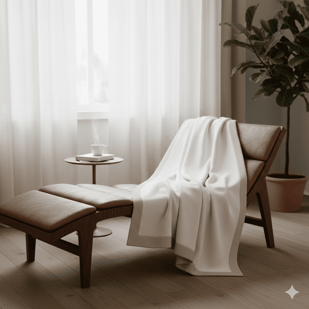 Con un tono blanco roto y un discreto ribete beige, esta manta encaja con la filosofía RAÍZ: piezas que no llaman la atención por estridencia, sino por armonía y presencia tranquila.