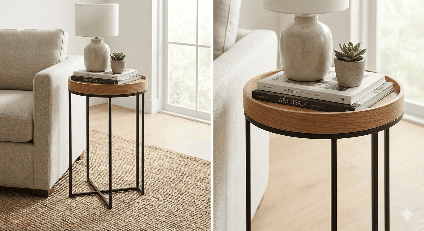 La mesa auxiliar “Ona” combina un tablero de madera de tono cálido con una estructura de acero lacado que aporta estabilidad y un contraste moderno. Su diseño ligero permite moverla con facilidad y adaptarla a diferentes rincones del hogar.