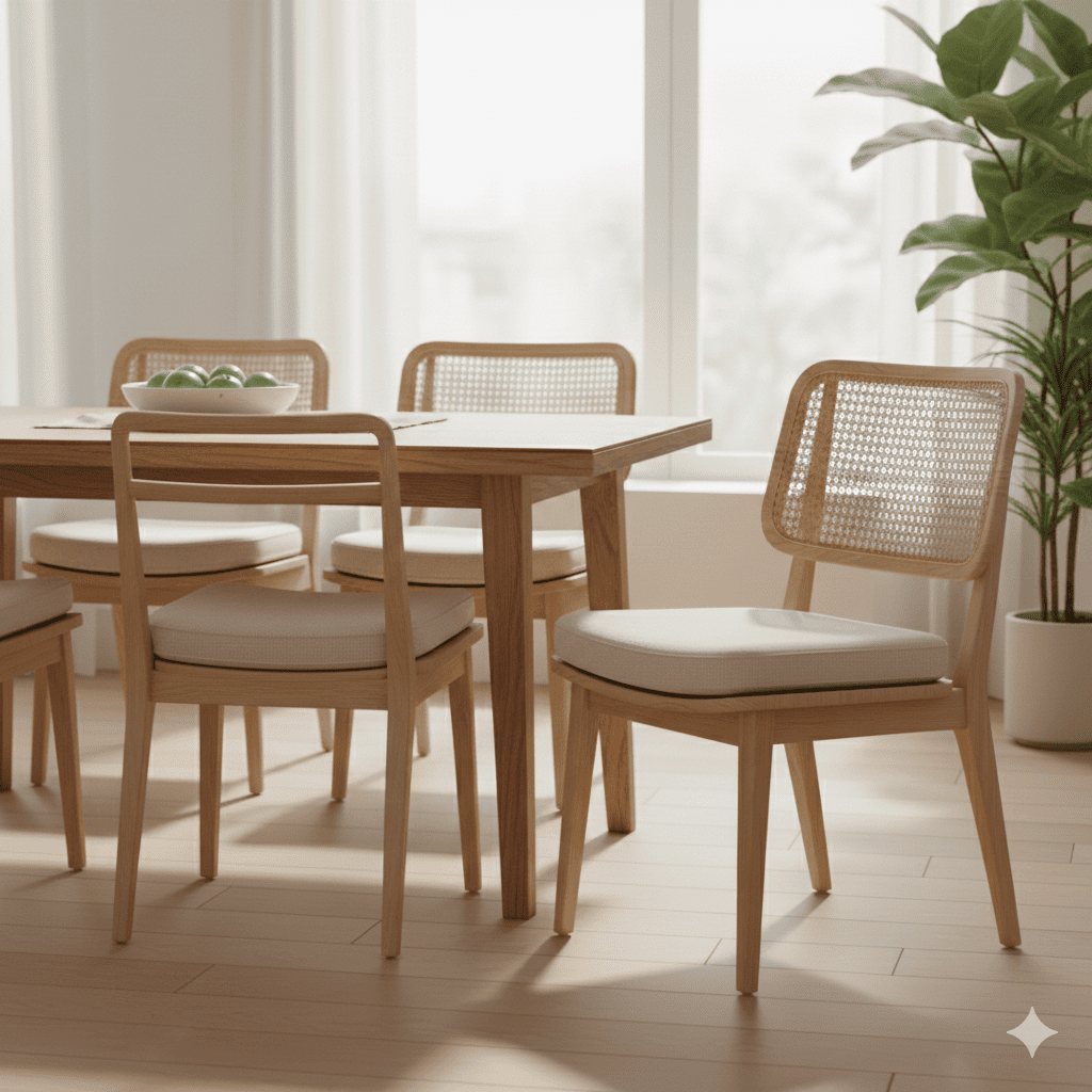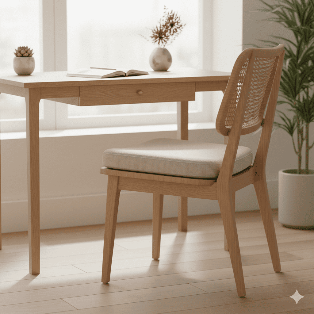 “Aurea” destaca por su respaldo de ratán artesanal y su estructura de madera sostenible. Su asiento ergonómico la convierte en una silla cómoda para comedor, escritorio o rincón de lectura. La combinación de materiales naturales crea una estética ligera, fresca y atemporal que enriquece cualquier ambiente.